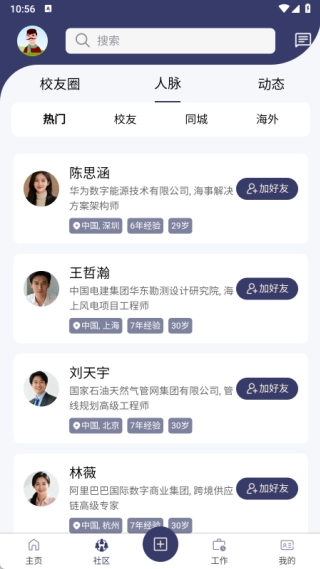 2、在社区主要包括校友圈、人脉和动态三个不同的版块,实时体验不同的功能;