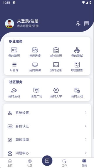 4、在我的页面中可以登录或注册,还有职业服务和社区服务等内容。